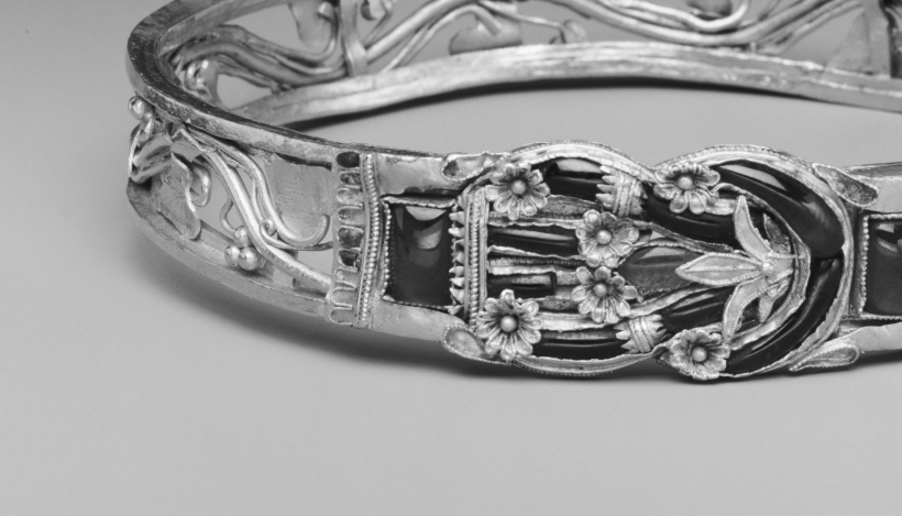 These are displayed in repoussé patterns worked in low relief. Among the most notable objects are a number of gold crowns usually in the form of elongated oval plates ornamented with fine work chiefly in the shape of rosettes and spirals.